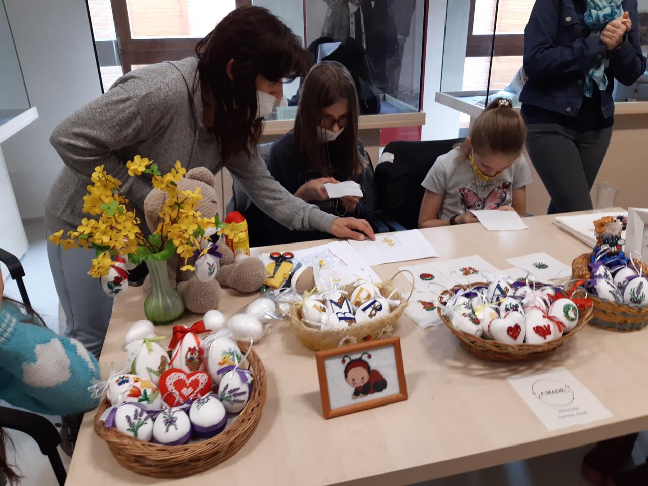 A nagy kiállítóteremben rendeztük be az alkotóműhelyt, ahol különböző technikákkal, egyszerűbbel és igényesebbel is lehetett tojásokat díszíteni, tavaszi dekorációt készíteni. A legkisebbek a kifestőknek örültek.